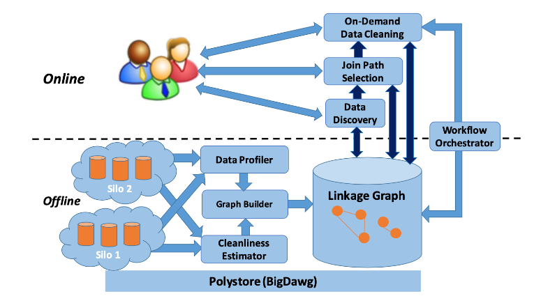 Online component에서는 dataset들의 검색, join path selection, cleaning 작업을 혼합하여 workflow를 생성하고, offline component의 linkage graph와 상호작용한다.